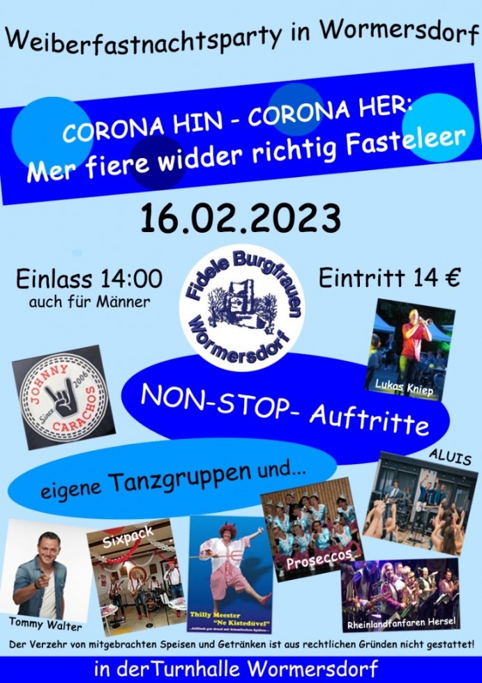 Ein tolles Programm erwartet Frauen und Männer mit den „Rheinlandfanfaren Hersel“, Sänger Tommy Walter, „Johnny Carachos“ (Männer-Showtanzgruppe), „Ne Kistedüvel“ – höllisch gut drauf! , Mitmach-Band „Sixpack“, Solotrompeter Lukas Kniep, Mundartband „ALIUS“ und dem abendlichen Auftritt der Tänzerinnen „Proseccos“.